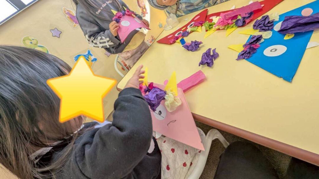 2月3日「節分製作をしました🌱⋆。」節分に向けて、鬼の製作を楽しみました。花紙をくしゃっと丸めて髪の毛に見立てたり、好きな色を選んで貼ったりと、一人ひとり個性あふれる鬼が完成しました。指先を使いながら、集中して取り組む姿が見られました。節分の行事として、鬼に向かって豆まき遊びを楽しみました。「おにはそと!」と元気いっぱいにボールを投げ、笑顔や少しドキドキした表情も見られました。行事ならではの雰囲気を味わいながら、楽しい時間を過ごしました。