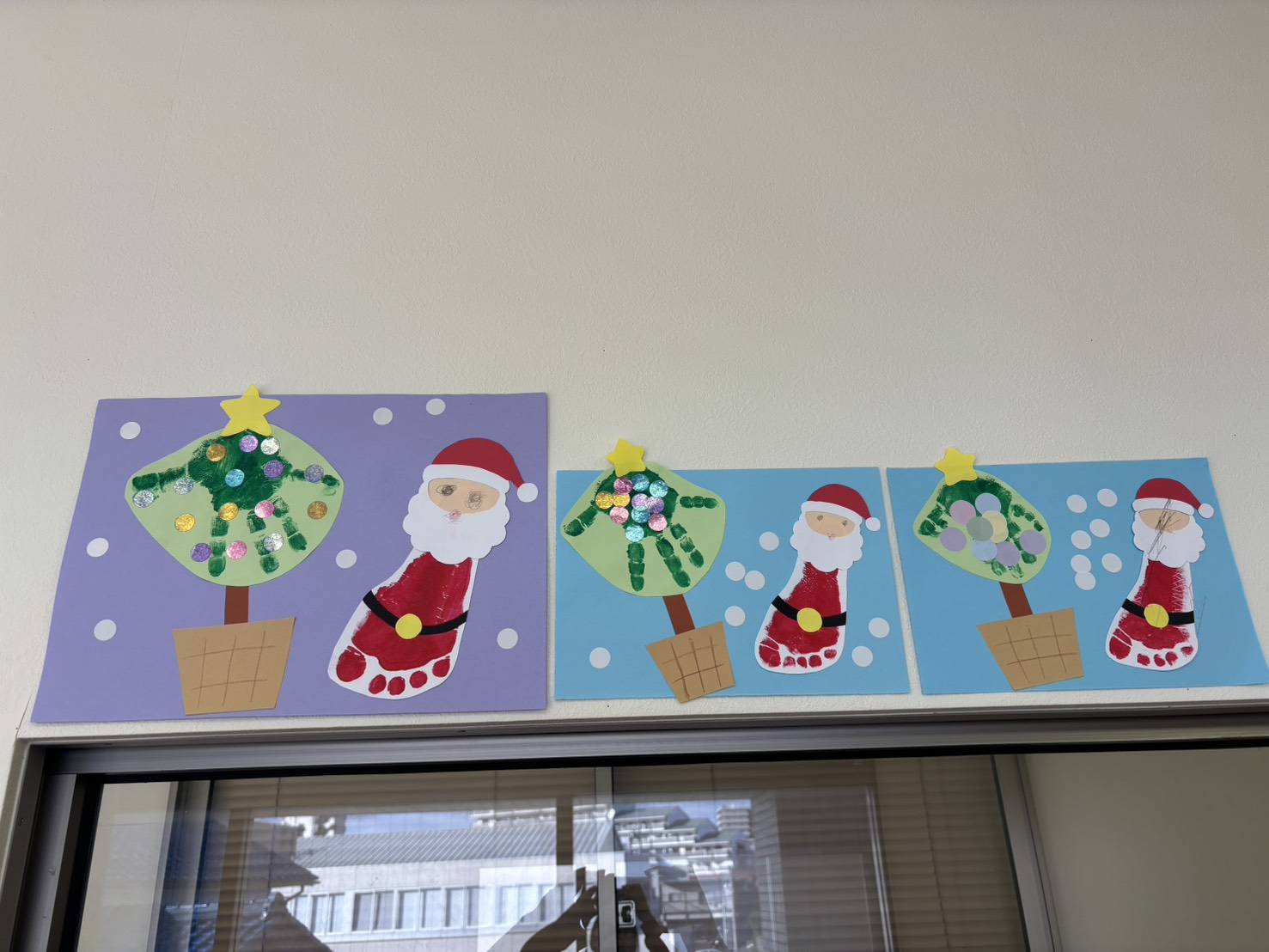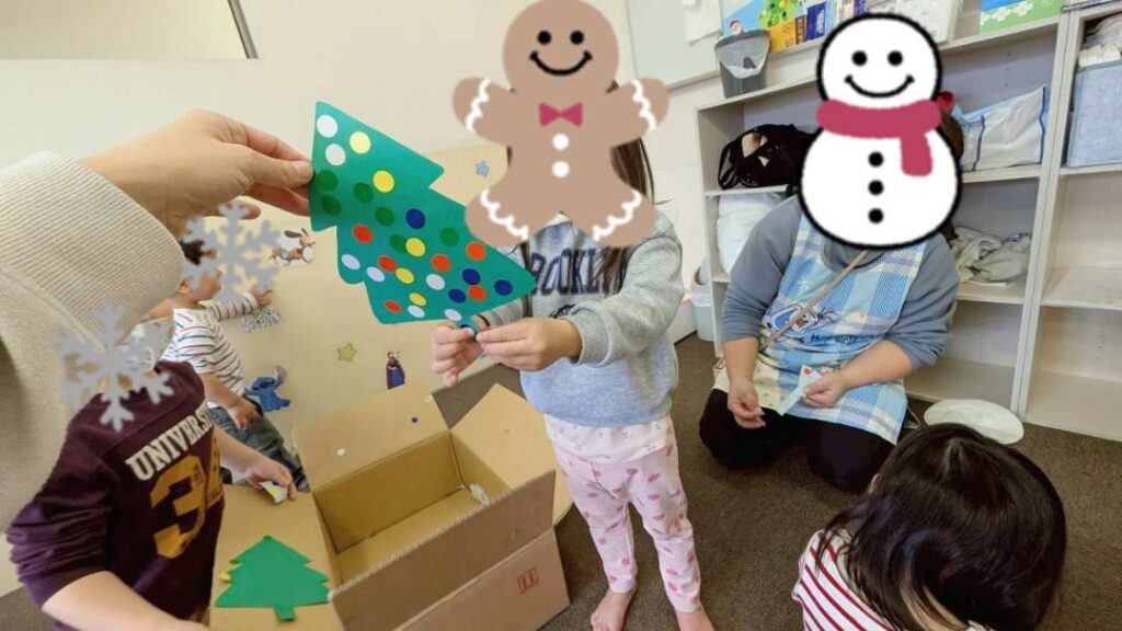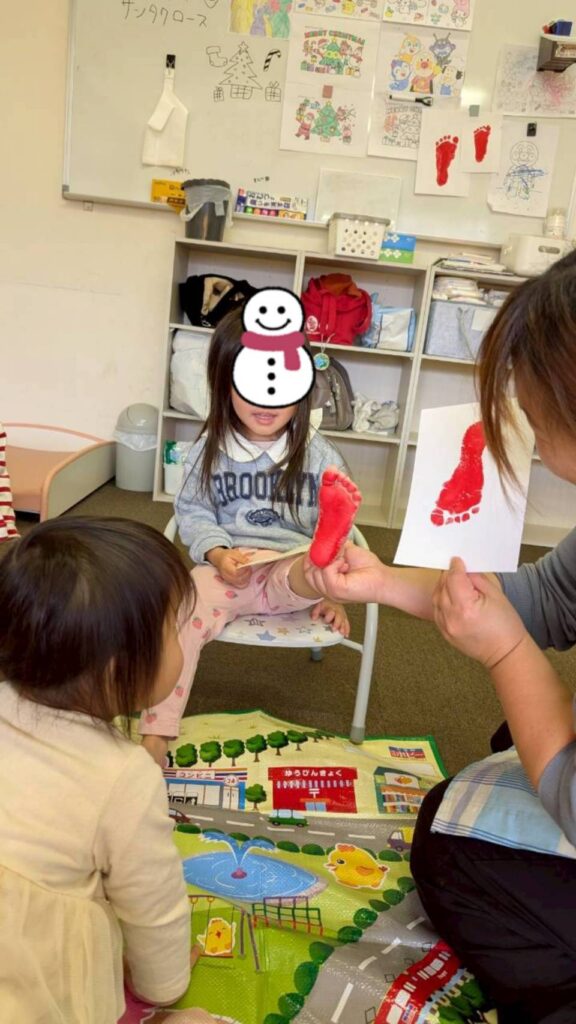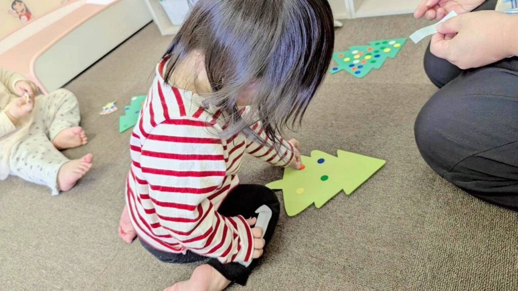 ツリーの形の台紙に、シールを貼ったり、絵の具で手形・足形を取ったりして、かわいい作品作りを楽しみました。